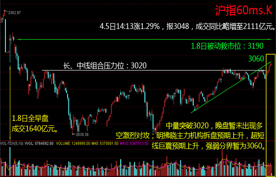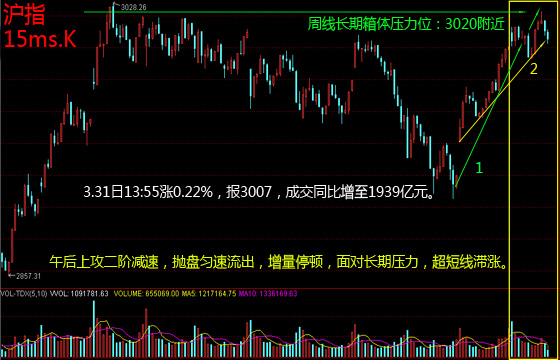 今日收盘,沪指涨1.45%,成交增至2767亿元,报3053,创猴年来反弹新高,并一度站上中长线组合压力位3020,全天维持中量上攻,晚盘未现多空激烈交火,机构拆盘预期或推迟于明早在3060附近兑现。创业板涨3.36%,报2279,成交增至1223亿元,增量态势未现重大改观。今亚太股市普遍低迷,受日本3月PMI打压,日经指数领跌该地区;明日中国3月财新综合与服务业PMI出炉。