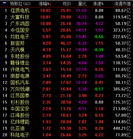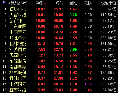 13:24,创业板涨2.86%,报2268,成交同比略增至726亿元,特斯拉、充电桩保持领涨,锂电池跟涨,新能源汽车主题共15股涨停;阿里、电商、国产软件午后拉升。