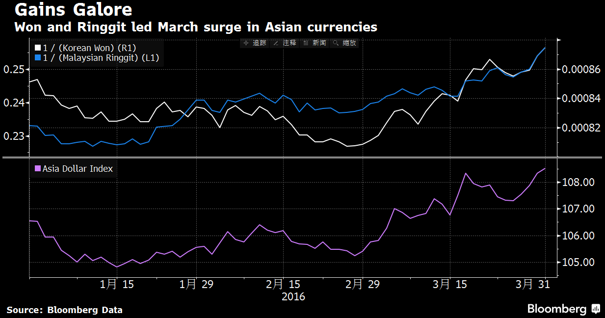在3月份亚洲货币的涨势中,韩元以8.2%的涨幅领涨,马来西亚令吉大涨7.8%,创出1998年以来最大涨幅。