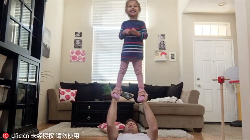 可爱女儿当哑铃 美国爸爸健身无处不在